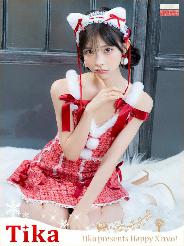 サンタコス 2点set ミックスツイードウエストカットサテンリボンフレアスカートガーリー猫アニマルサンタコスプレドレスの1枚目