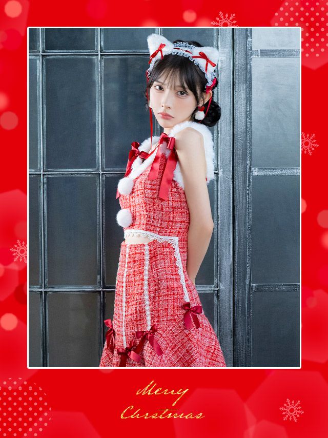 サンタコス 2点set ミックスツイードウエストカットサテンリボンフレアスカートガーリー猫アニマルサンタコスプレドレスのセット内容