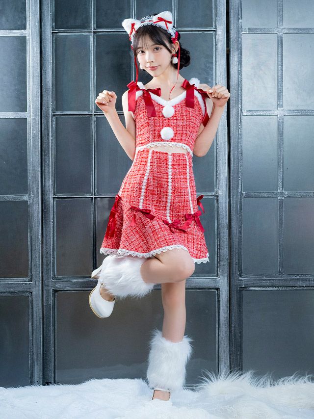 サンタコス 2点set ミックスツイードウエストカットサテンリボンフレアスカートガーリー猫アニマルサンタコスプレドレスのディティール1枚目