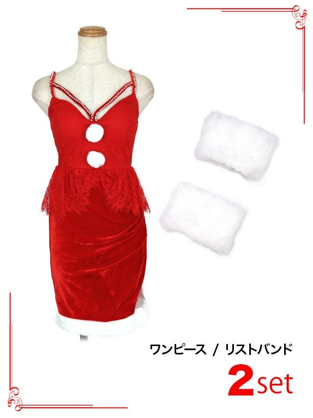 サンタコス 2点set レースペプラムスリット入りデザインセクシー サンタ コスプレ [ワンピース+リストバンド]