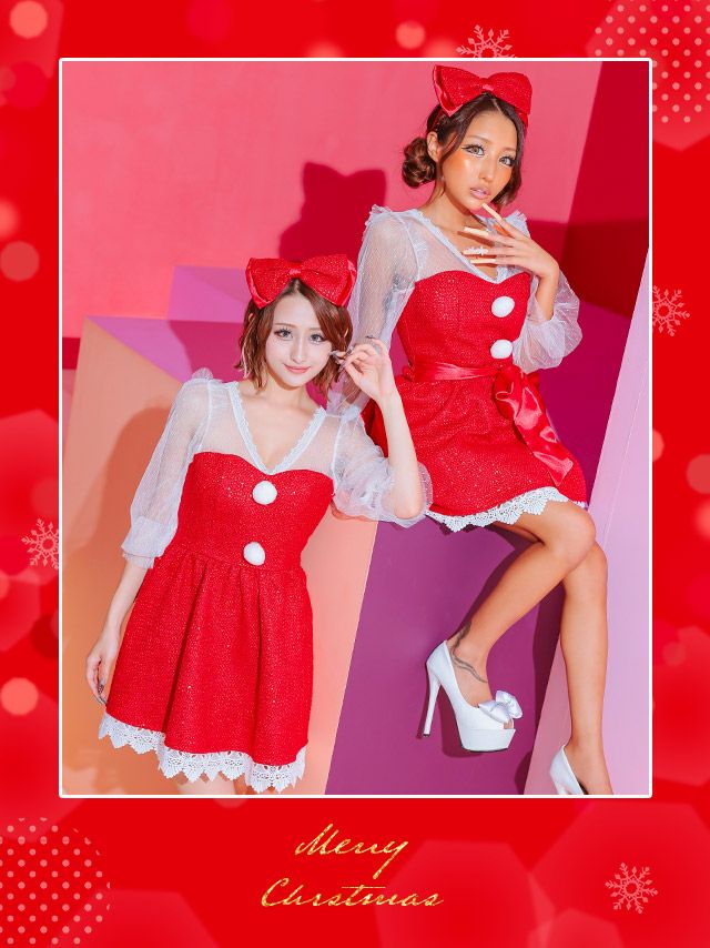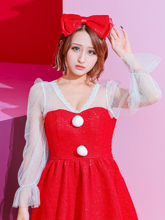 サンタコス 2点set パフスリーブ袖ありシアーツイードレーススパンコールフレアスカートガーリー王道ペア サンタ コスプレ [ワンピース+カチューシャ](S~L)