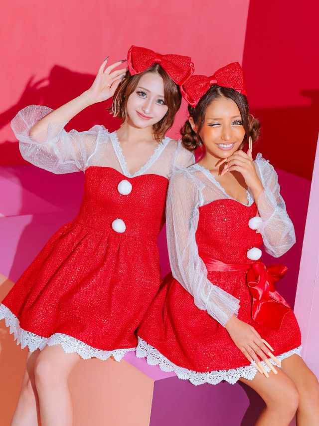 サンタコス 2点set パフスリーブ袖ありシアーツイードレーススパンコールフレアスカートガーリー王道サンタペアコスプレの1枚目