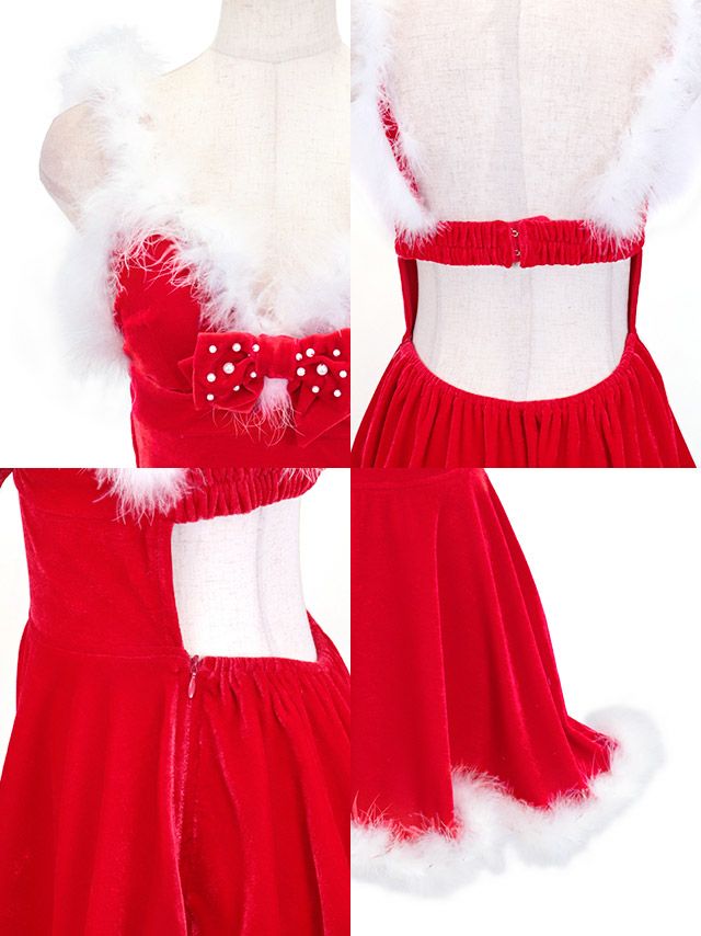 サンタコス 4点set フェザーフロントリボン付きバックオープンフレアサンタコスプレ