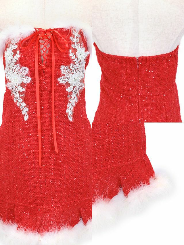 5. サンタコス 2点set ツイード×ファー胸元編み上げベアトップサンタ コスプレ [ワンピース+サンタ帽子](S~L)