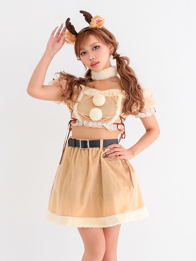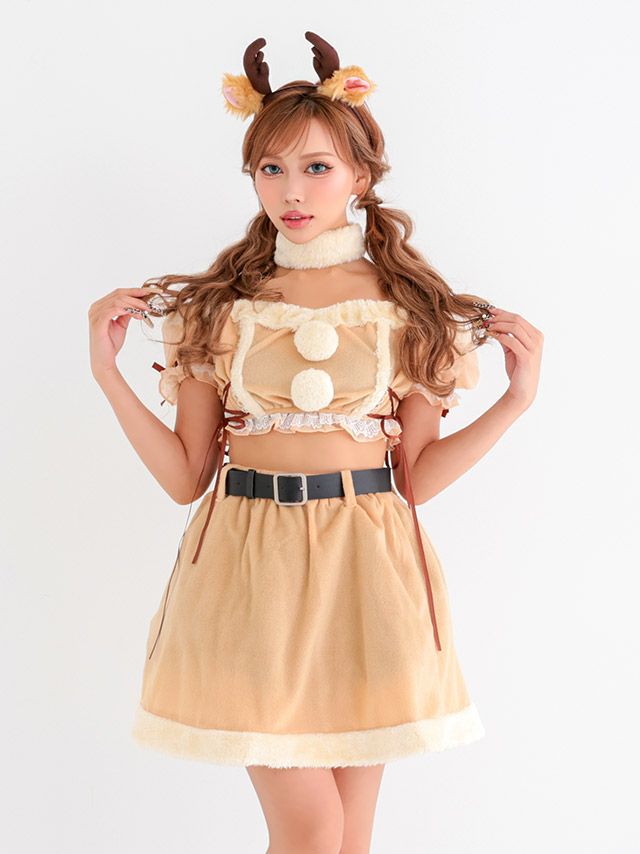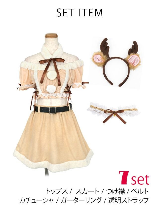 3. [新作]サンタコス 7点set ふわふわ トナカイ オフショル フレア セットアップ コスプレ [カチューシャ+付け襟+トップス+透明ストラップ+スカート+ベルト+ガーターリング]