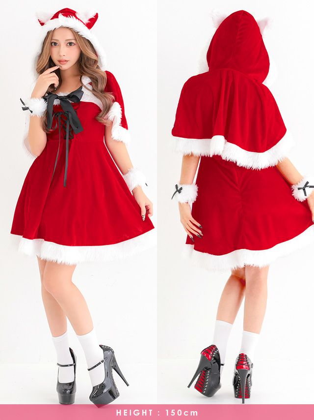 [新作]サンタコス 4点set 猫耳付きケープ レースアップ ベアワンピース 猫 アニマル ふわふわ サンタ コスプレ [フード付きケープ+ワンピース+カフス+透明ストラップ]