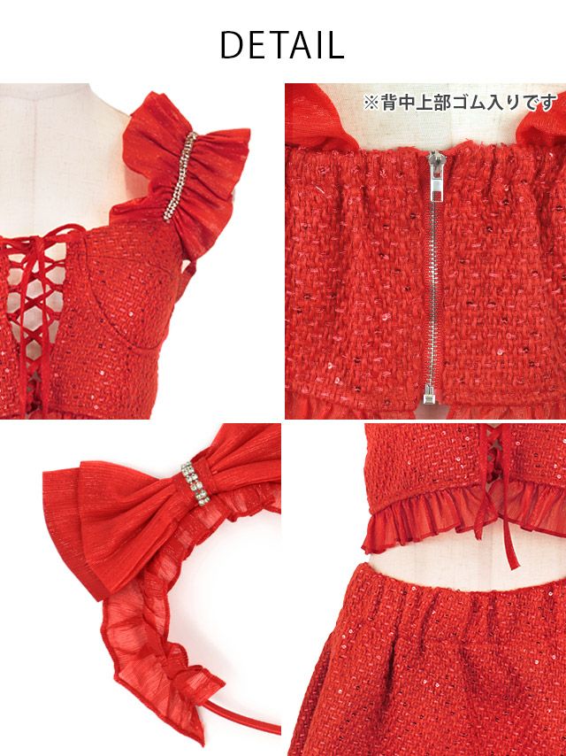 6. サンタコス 3点set ツイード ラメ フレアスカート フロントレースアップ フリル リボンビジュー セットアップ ドレスサンタ コスプレ [トップス+スカート+カチューシャ]