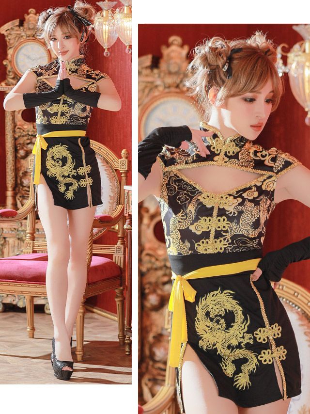 3. [セール][再入荷]コスプレ バストカットゴールドデザインセクシータイトミニチャイナドレス [3点セット] (ワンピース/手袋/紐)