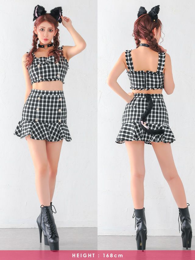 3. [セール]コスプレ ノースリーブ ツイード セットアップ アニマル 猫 千鳥柄 フレアスカート[4点セット] (トップス/スカート/カチューシャ/チョーカー)(S~L)