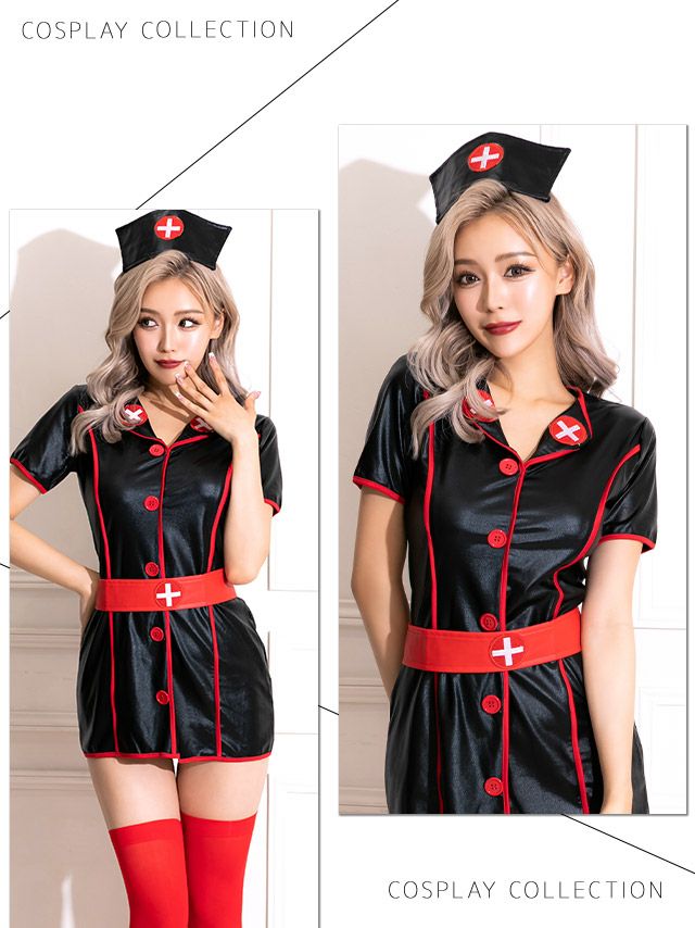 [セール]コスプレ 4点set レザー調パイピングタイトミニブラックプチプラセクシーナース [ナース服+帽子+靴下+ベルト]