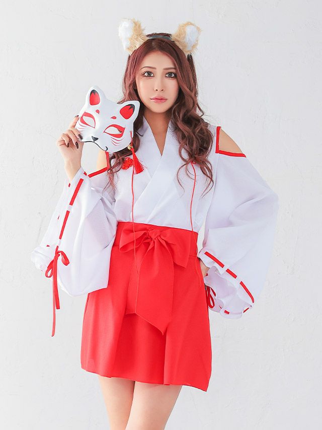コスプレ 和装 フレアスカート アニマル 巫女 狐 リボン 体型カバーの商品画像1枚目