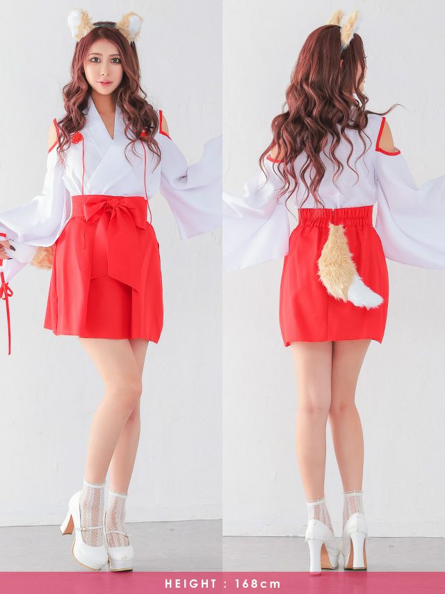 3. コスプレ 和装 フレアスカート アニマル 巫女 狐 リボン 体型カバー [4点セット] (トップス/スカート/カチューシャ/しっぽブローチ)