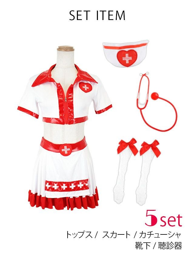 4. コスプレ セクシー ジップデザイン 谷間魅せ ナース[5点セット]【トップス/スカート/カチューシャ/靴下/聴診器】