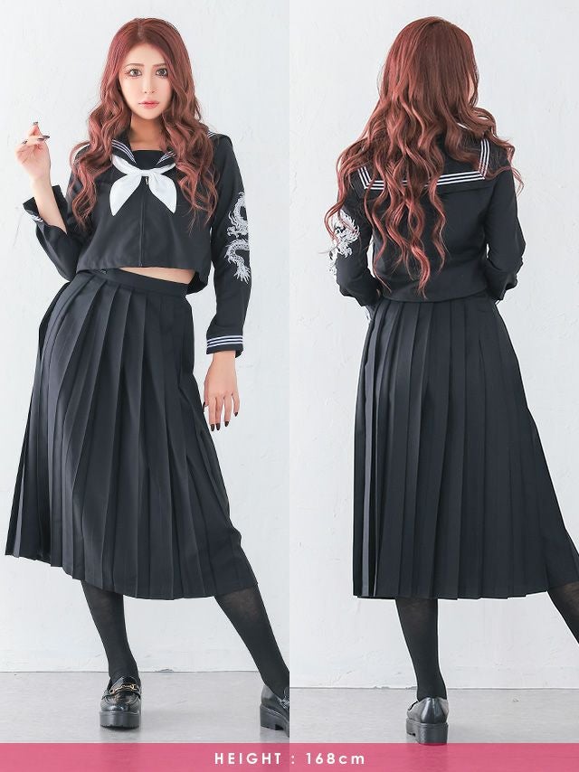 3. [セール][再入荷]コスプレ セーラー制服 ロング ドラゴン刺繍 体型カバー ガーリー[4点セット](セーラー服上下/スカーフ/ソックス)(S~XXL)