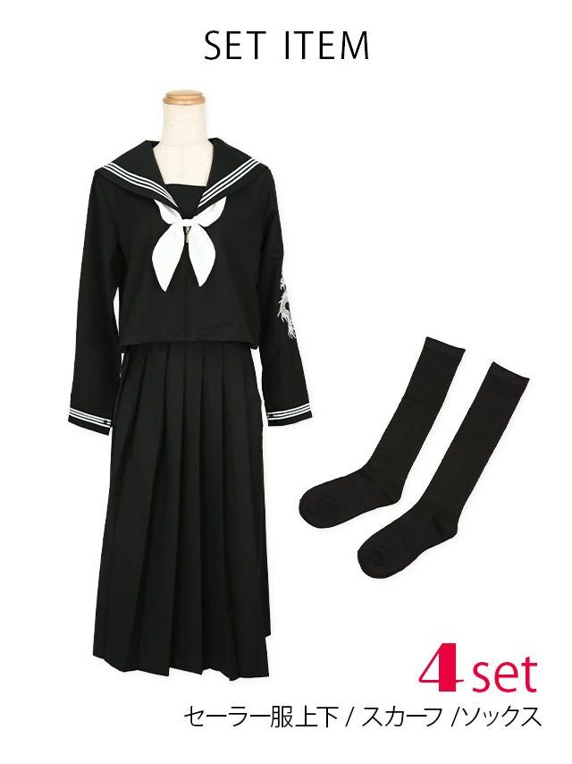 4. [セール][再入荷]コスプレ セーラー制服 ロング ドラゴン刺繍 体型カバー ガーリー[4点セット](セーラー服上下/スカーフ/ソックス)(S~XXL)