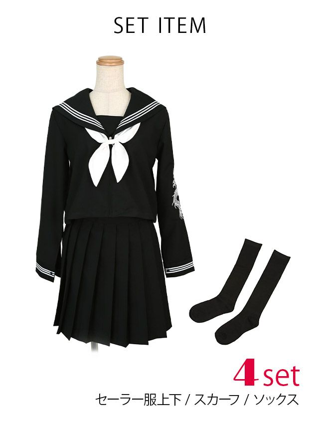 4. [セール][新作][再入荷]コスプレ ドラゴン刺繍 セーラー制服 ミニ スカート ペア 長袖 [4点セット] (セーラー服上下/スカーフ/ソックス)(S~XXL)