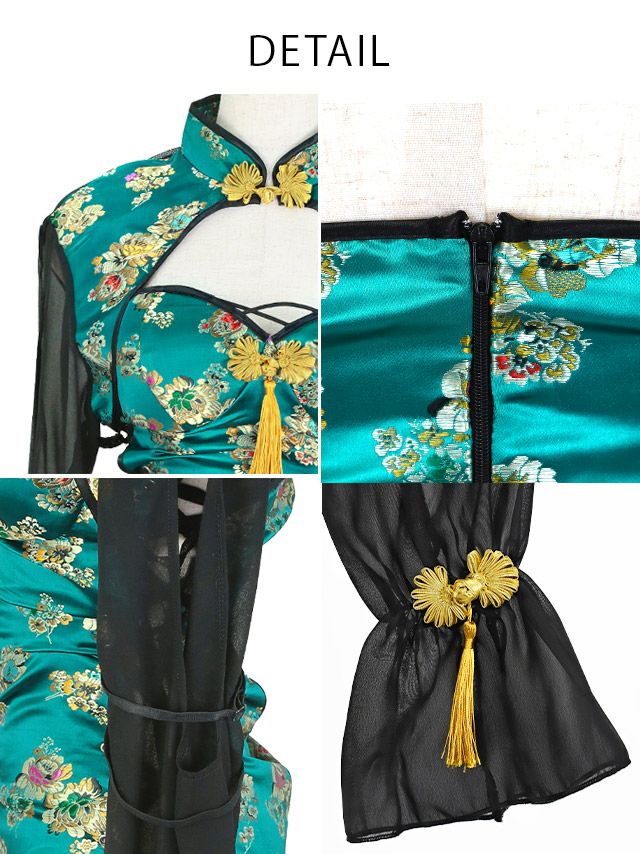コスプレ バストカット シアスリーブ チャイナドレス ガーター ハロウィンコスプレ5点セット [ジャケット+ワンピース+お団子カバー+ガーター+透明ストラップ]のディティール2