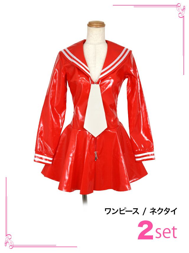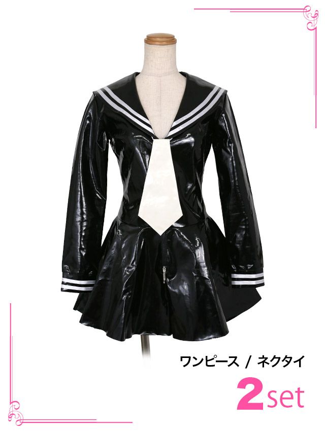 コスプレ エナメルレザー長袖体型カバープリーツミニフレアスカートセクシーセーラー服 [2点セット] (ワンピース/ネクタイ)
