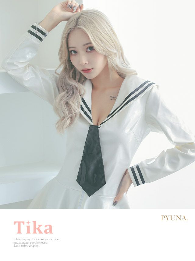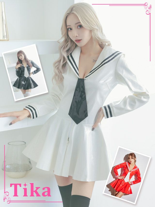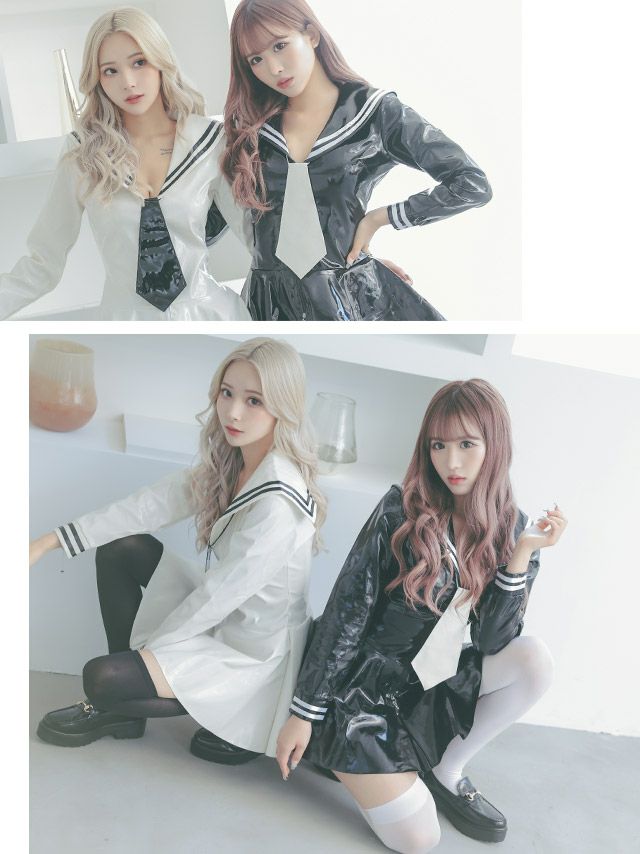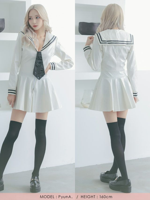 4. コスプレ エナメルレザー長袖体型カバープリーツミニフレアスカートセクシーセーラー服 [2点セット] (ワンピース/ネクタイ)
