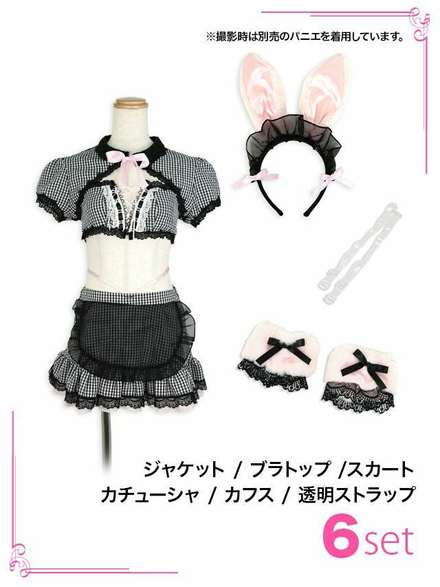 4. [セール][再入荷]コスプレ ギンガムチェックメイド風バニーガール セクシーハロウィンコスプレ6点セット [ジャケット+ブラトップ+スカート+カチューシャ+カフス+透明ストラップ]