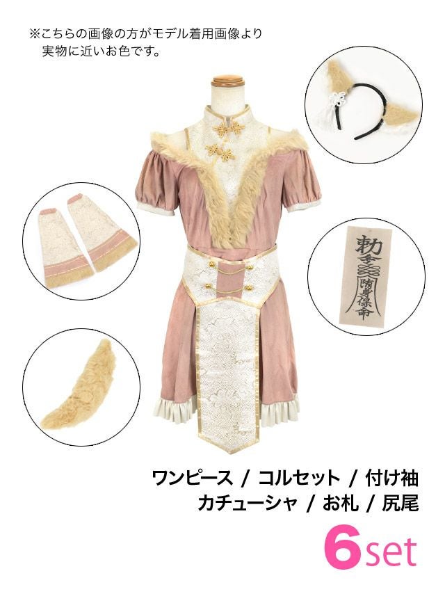 4. コスプレ 袖ありフレアスカート体型カバー個性キョンシーキャラクターガーリー狐アニマル [6点セット] (ワンピース/コルセット/付け袖/カチューシャ/お札/しっぽ)