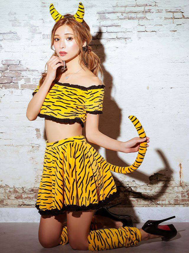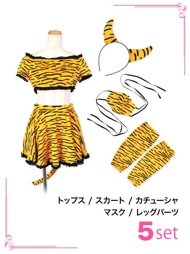 5. コスプレ 尻尾付きフレアスカートオフショルヘソ出しガーリーペア鬼アニマル[5点セット] (トップス/スカート/カチューシャ/マスク/レッグパーツ)(S~L)