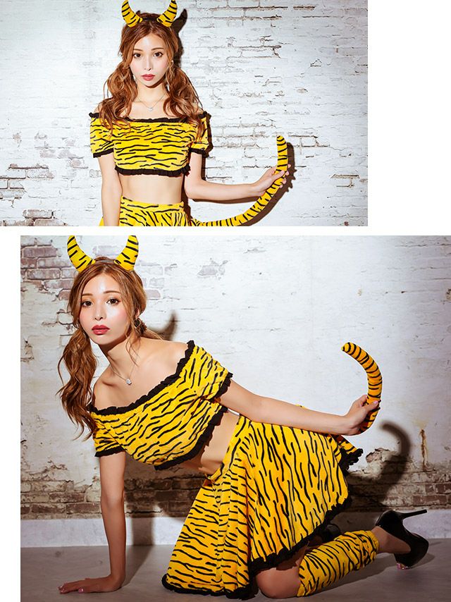 コスプレ レディース 衣装 仮装 可愛い かわいい 通販 myMinette マイミネット 尻尾付きフレアスカートオフショルヘソ出しペア鬼アニマル