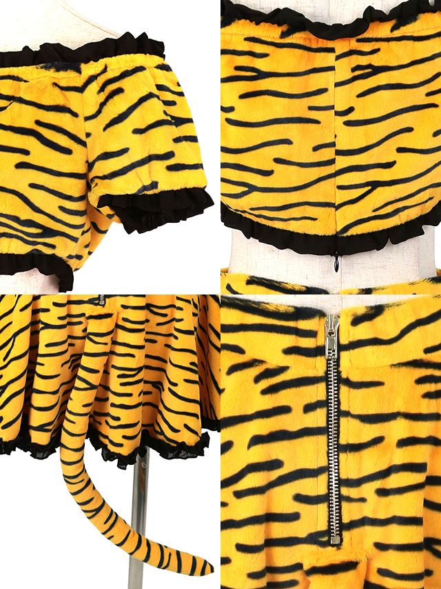 4. コスプレ 尻尾付きフレアスカートオフショルヘソ出しガーリーペア鬼アニマル[5点セット] (トップス/スカート/カチューシャ/マスク/レッグパーツ)(S~L)