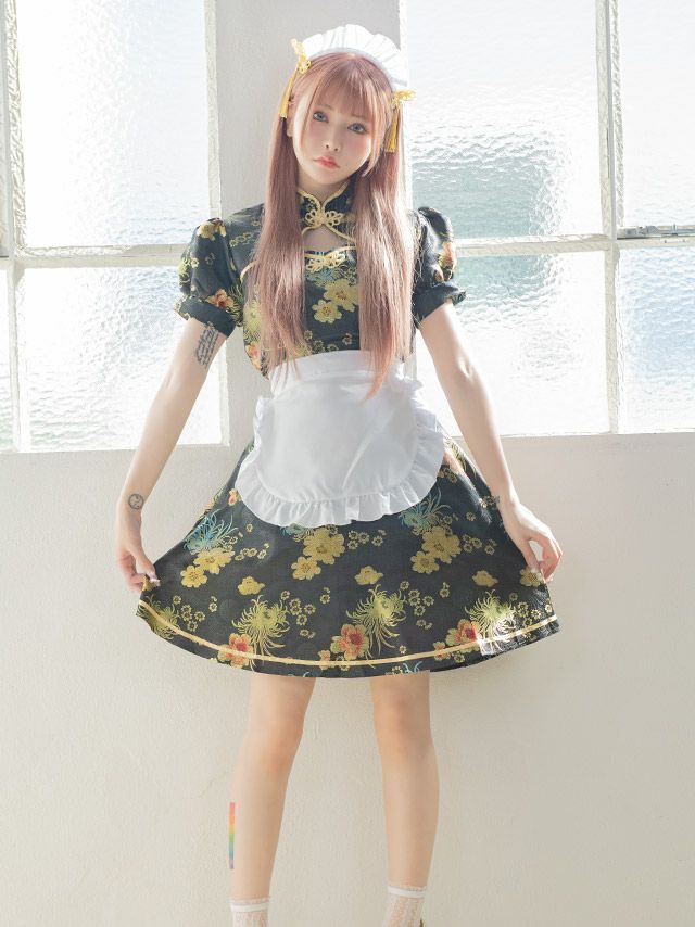 コスプレ ハロウィン メイド服 チャイナ服 衣装 仮装 myMinette マイミネット フレアスカート体型カバーパイピング刺繍メイドチャイナドレス