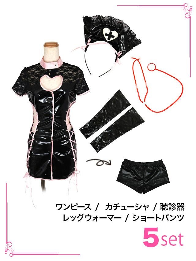 コスプレ レザー×レースサイド編み上げハート型バストカットブラックセクシーナース [5点セット] (ワンピース/カチューシャ/聴診器/レッグウォーマー/ショートパンツ)