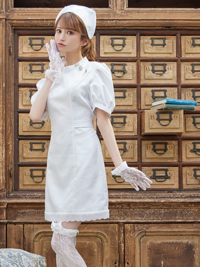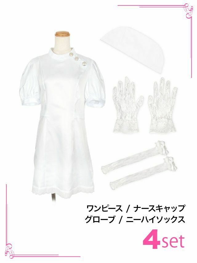 4. コスプレ ワンカラーロリータ風レースセクシーペアナース [4点セット] (ワンピース/ナースキャップ/グローブ/ニーハイソックス)