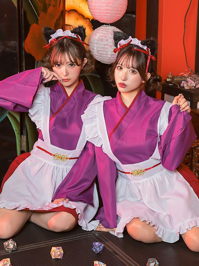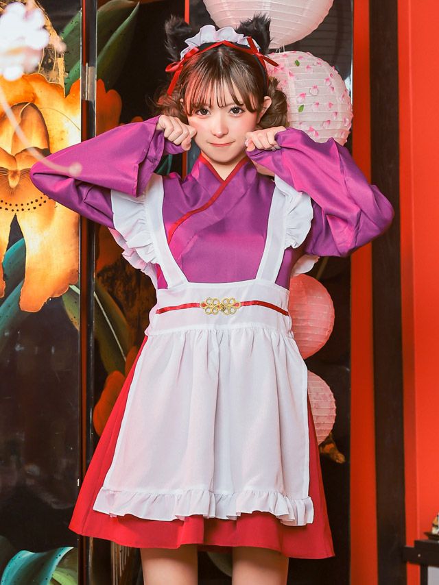 5. コスプレ 和風猫メイド長袖体型カバーフレアスカート個性ガーリーアニマル和装 [3点セット] (ワンピース/エプロン/カチューシャ)