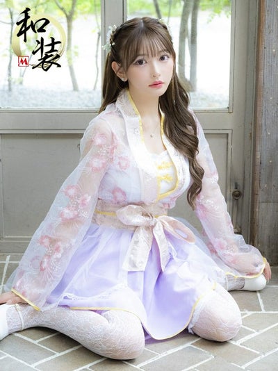 4. コスプレ フラワー刺繍×ウエストリボン付き袖ありシアーフレアスカート体型カバーガーリー和装束 [5点セット] (ヘアピン/トップス/着物/スカート/透明ストラップ)