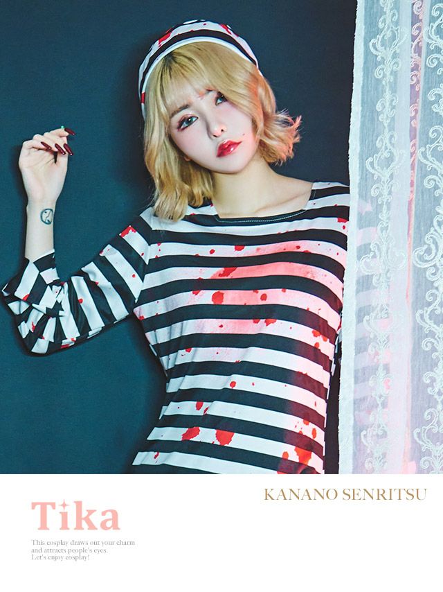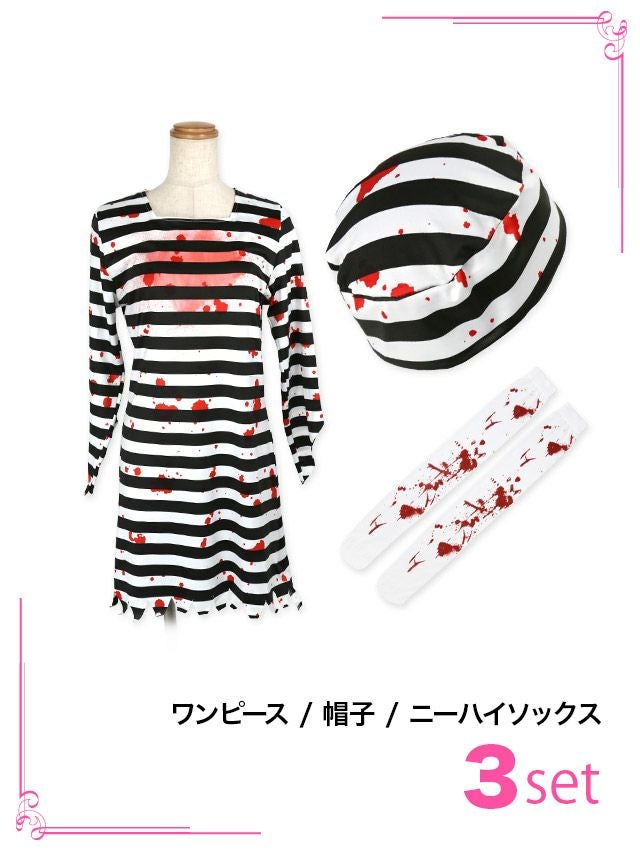 コスプレ 血まみれホラー囚人ゾンビ ガーリーハロウィンコスプレ3点セット [ワンピース+帽子+ニーハイソックス]