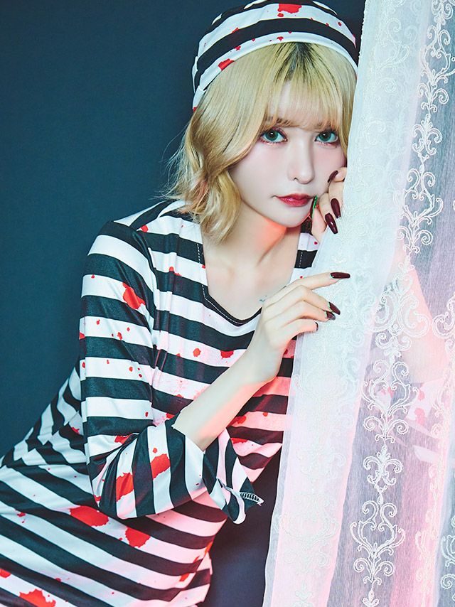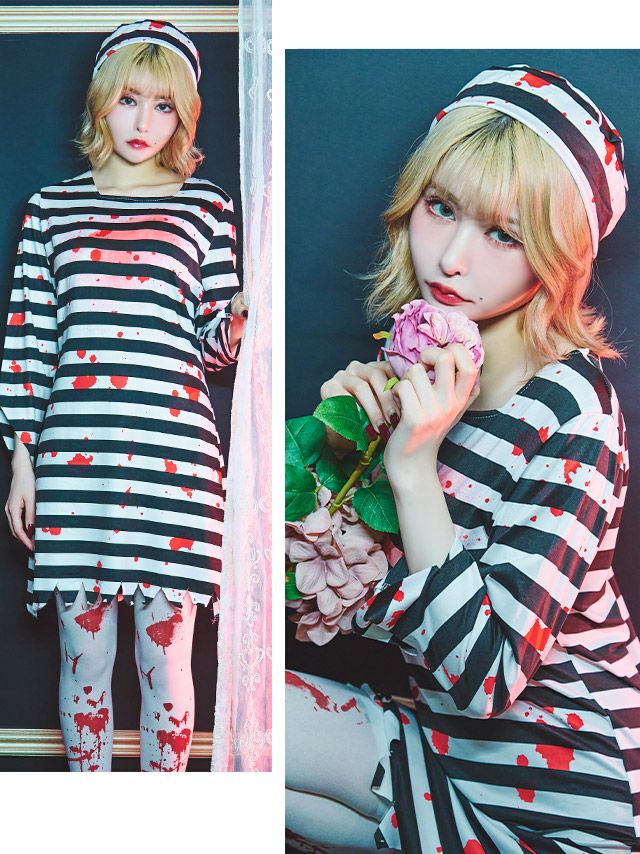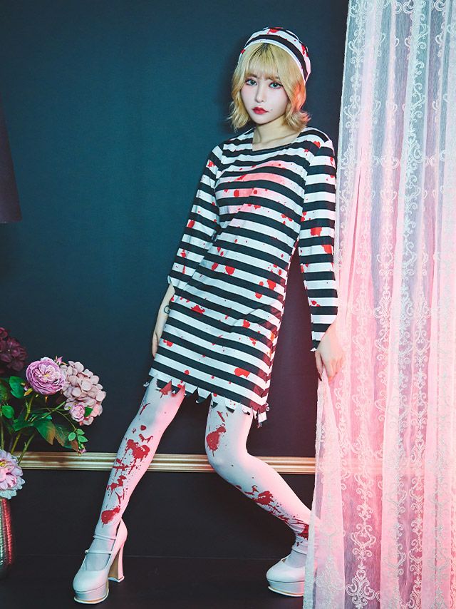 4. コスプレ 血まみれホラー囚人ゾンビ ガーリーハロウィンコスプレ3点セット [ワンピース+帽子+ニーハイソックス]