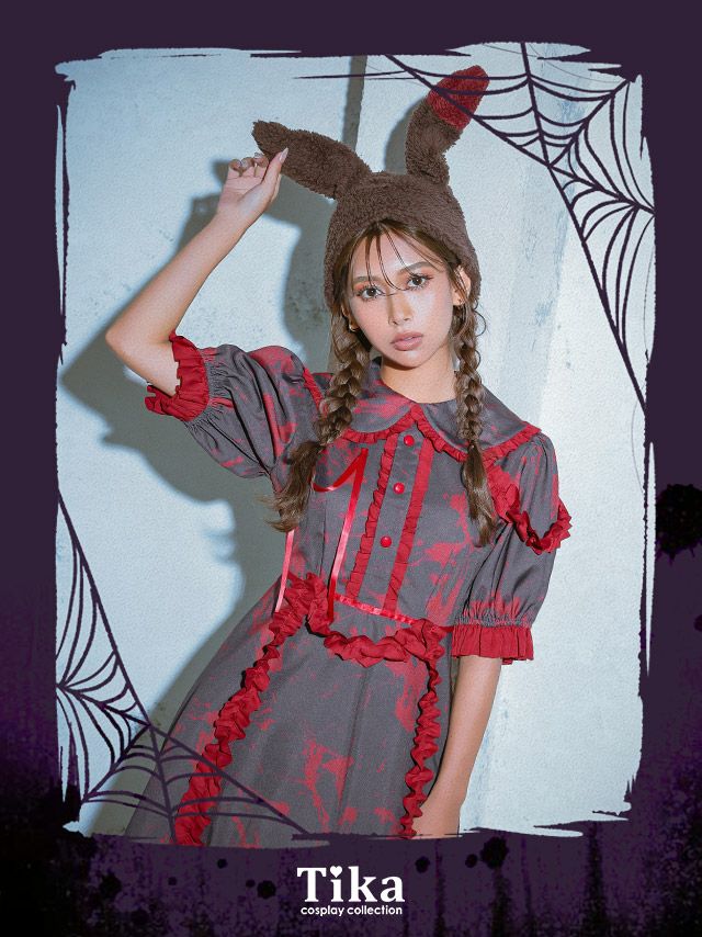 4. [セール]コスプレ 血のりプリント付き体型カバーフレアスカートホラーバニードールアニマル [2点セット] (ワンピース/帽子)