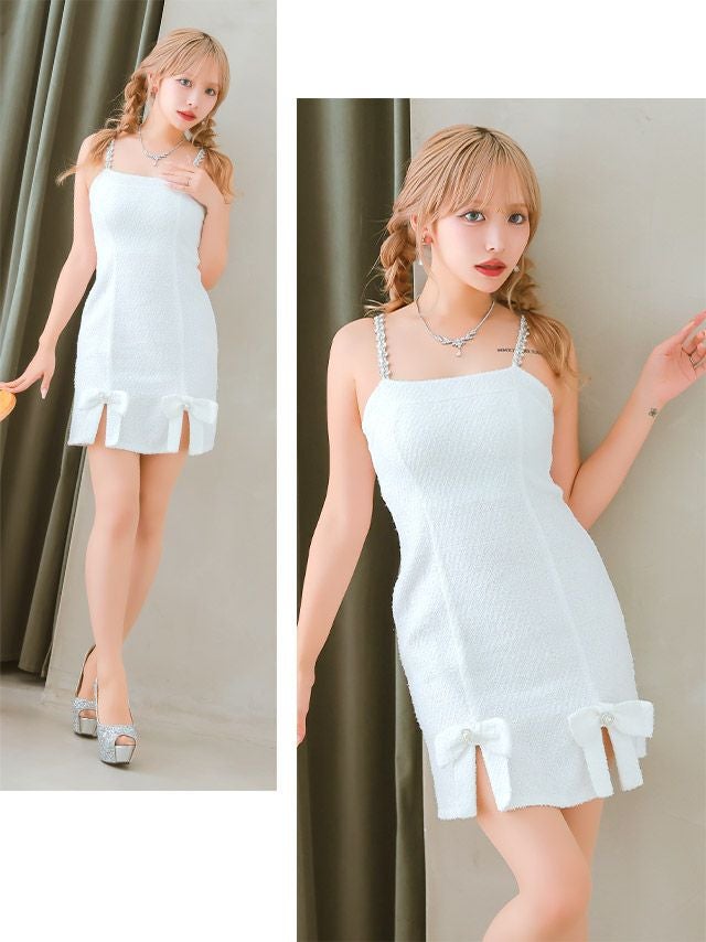 4. [アウトレット]チェーン キャミソール ツイード ラメリボン ガーリー フレアミニドレス (Sサイズ~Lサイズ) (りせり/キャバドレス着用)