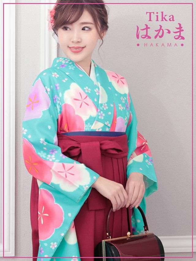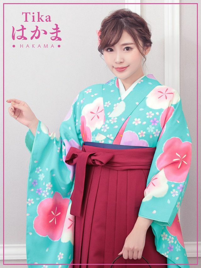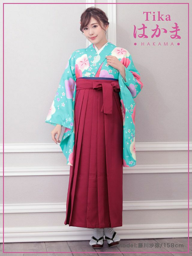 藤川沙弥 はかま着用 レトロ梅模様 袴3点セット (二尺袖着物+袴下帯+袴) (水色地/赤)