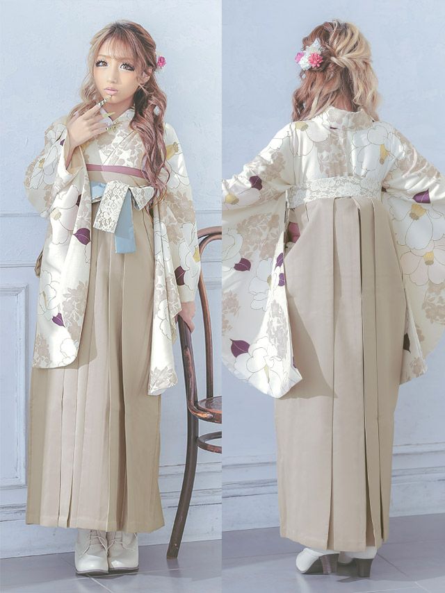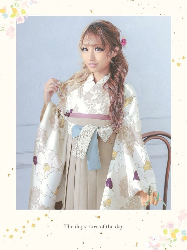 葉がパープルで袴のベージュや着物のクリーム色と