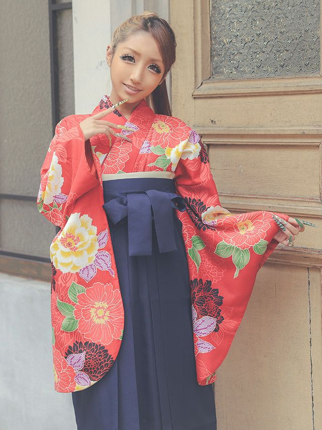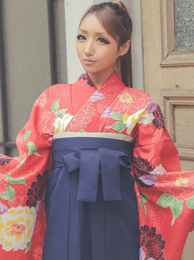 着物の朱色と袴の紺色がコントラストとなって