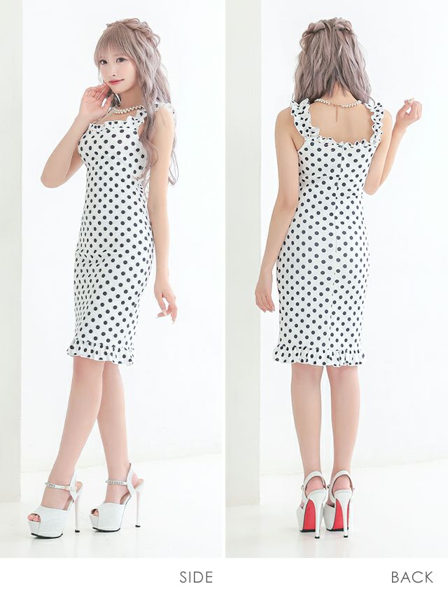 キャバドレス 安い 激安 ミニ丈 キャバクラ クラブ ラウンジ フリル スクエア ネック タイト ドット柄 ガーリー プチプラ 膝丈 ドレス プチプラドレス