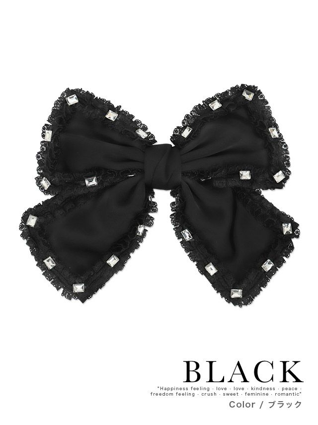 ストーンビジュー付きレースフリルパイピングリボンバレッタヘアアクセサリー