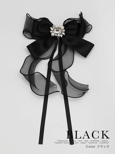 ビジュー付きチュール&サテンロングリボンバレッタヘアアクセサリー