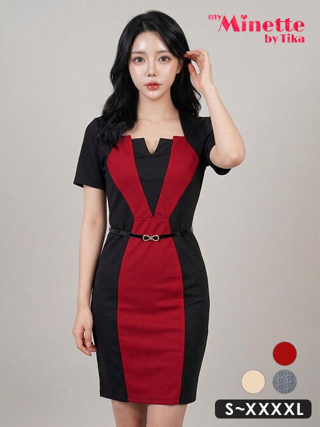 ベルト付きバイカラー半袖タイトワンピースミニドレスカラーバリエーション