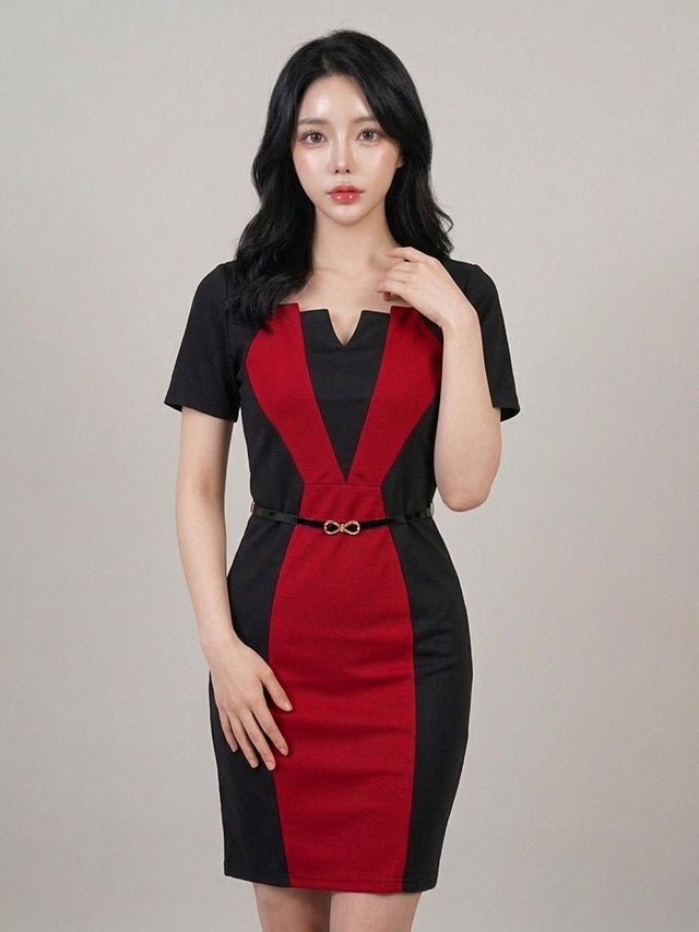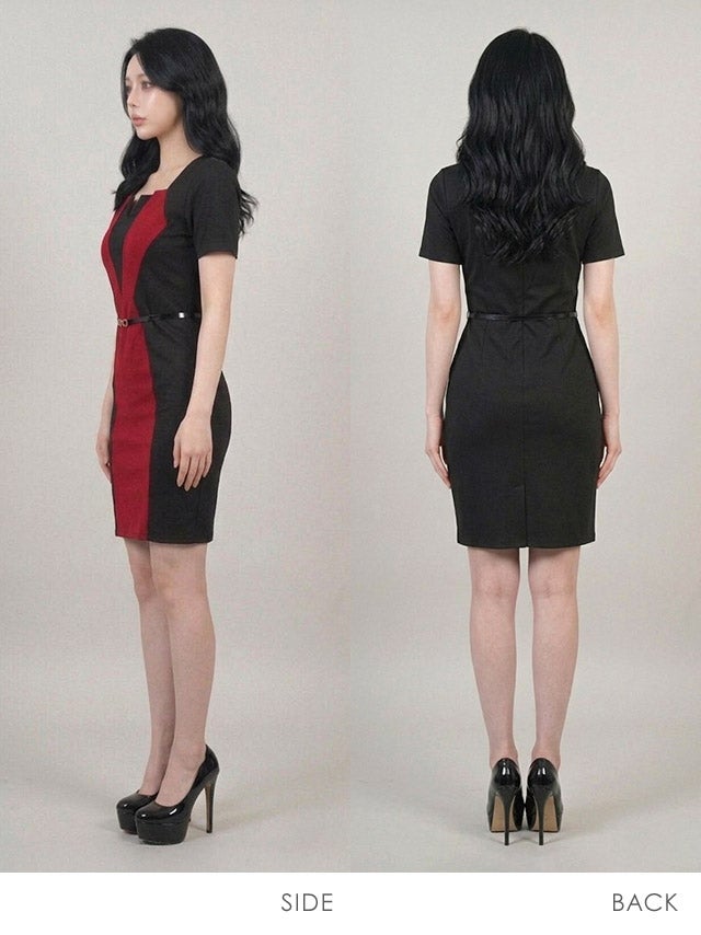 ベルト付きバイカラー半袖タイトワンピースミニドレスサイドバック