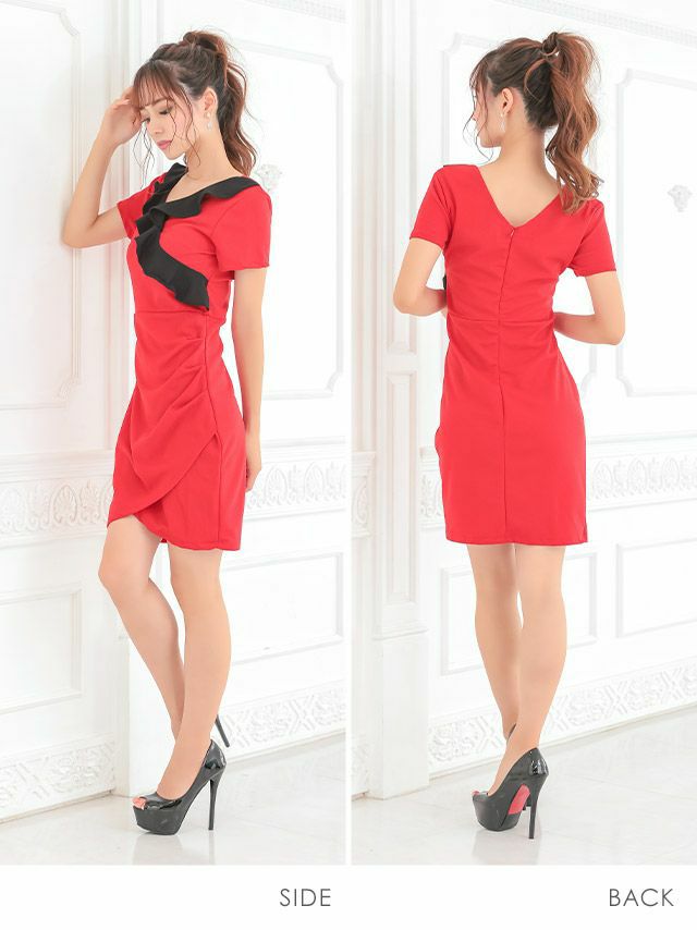 キャバドレス 安い 激安 ミニ丈 キャバクラ クラブ ラウンジ サイドギャザー入り 胸元フリル タイト 半袖 ミニドレス プチプラドレス