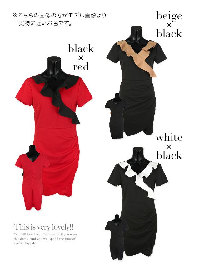 キャバドレス 安い 激安 ミニ丈 キャバクラ クラブ ラウンジ Vネック 胸元フリル バイカラー タイト 半袖 ミニドレス プチプラドレス