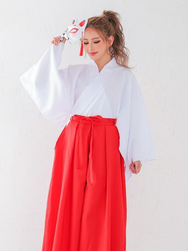 3. [セール]コスプレ 巫女 和装 ウエストリボン 長袖 体型カバー ロング丈 2点セット (上衣/袴)