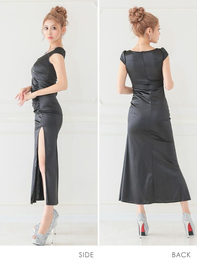 バストカット パール スリット 半袖 サテン タイト ロングドレスの商品画像