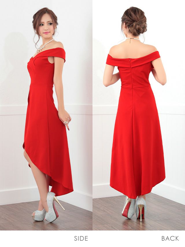 オフショルワンカラーアシメ丈ロングテールドレスサイドバック